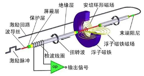 磁致伸縮液位計主要由電子部件、磁致伸縮波導絲、浮子等部分組成。測量時,電子部件產(chǎn)生一個電流“激勵”脈沖,該脈沖電流以光速沿波導絲向下運行,并在波導絲周圍形成周向安培環(huán)形磁場。當激勵脈沖電流產(chǎn)生的環(huán)形磁場與浮子內永磁鐵產(chǎn)生的偏置磁場相遇時,浮子周圍的磁場發(fā)生改變,從而使得由磁致伸縮材料做成的波導絲在浮子所在的位置產(chǎn)生一個感應扭轉波脈沖,該扭轉波以聲速由產(chǎn)生點向波導絲的兩端傳播,傳向末端的扭轉波被阻尼器件吸收,傳向激勵端的信號則被檢波裝置接收,并由電子部件測量出脈沖電流與扭轉波的時間差,再乘以扭轉波在波導絲中的傳播速度(固定量為2800m/s),即可計算出浮子產(chǎn)生扭轉波的位置與測量基準點間的距離,也就是液面的位置。磁致伸縮液位計傳感器原理見下圖。